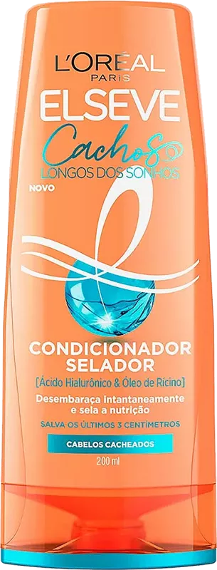 Condicionador Elseve Cachos Longos dos Sonhos para todos os tipos de cachos, desembaraçando instantaneamente os fios e preenchendo com nutrição profunda até às pontas. Sua fórmula com ácido hialurônico e óleo de rícino trata e sela os cachos, com uma ação imediata na fibra capilar deixando-os nutridos, soltos e definidos.